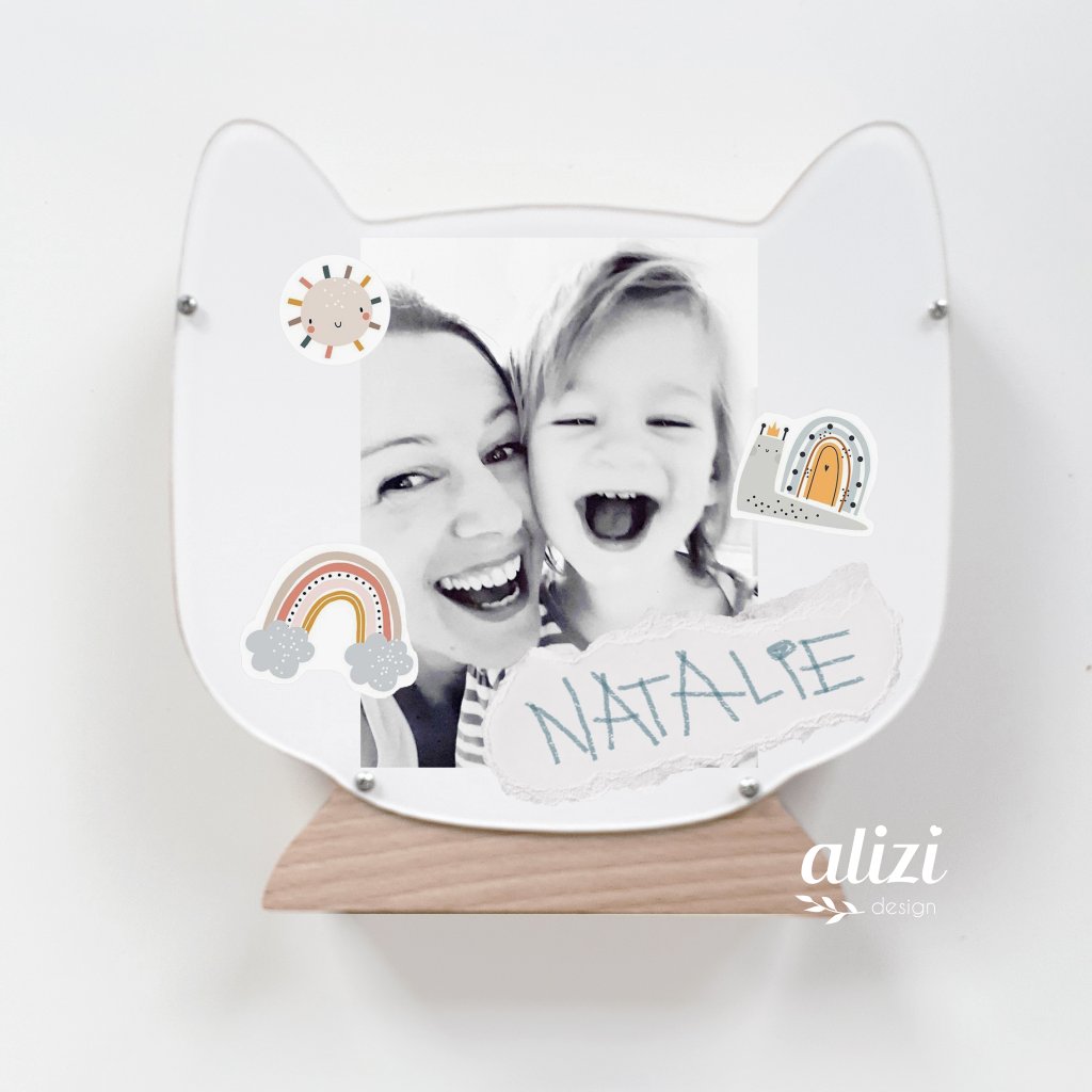 - Pokud chcete pokladničku předat jako dárek, můžete za zadní plexisklo vložit například jméno dítka, společnou fotograii, nebo věnování. (Inspiraci najdte mezi fotkami produktu.) Děti si ji v průběhu mohou přizpůsobovat i samy vložením svého obrázku, koláže ze samolepek, vlastnoručně napsaným jménem, ...